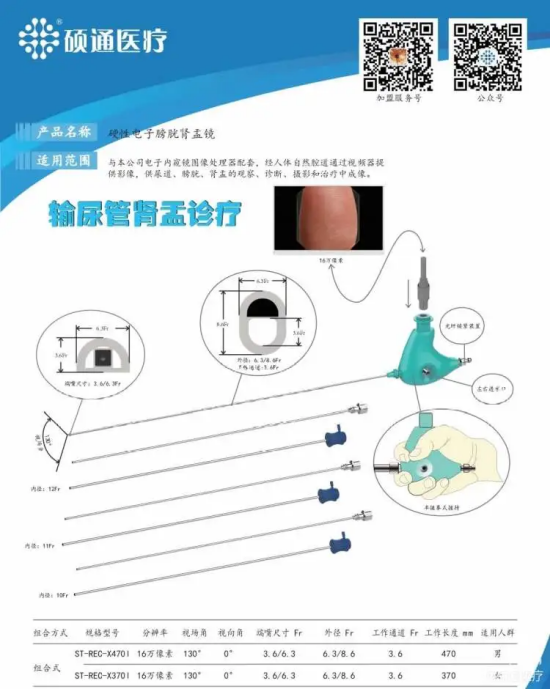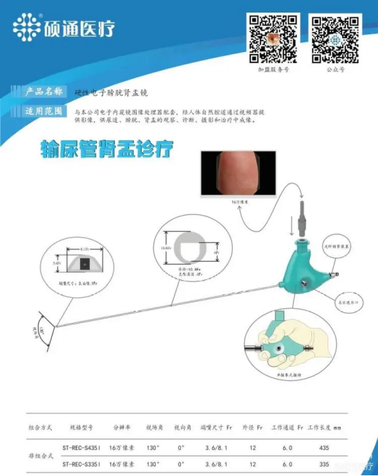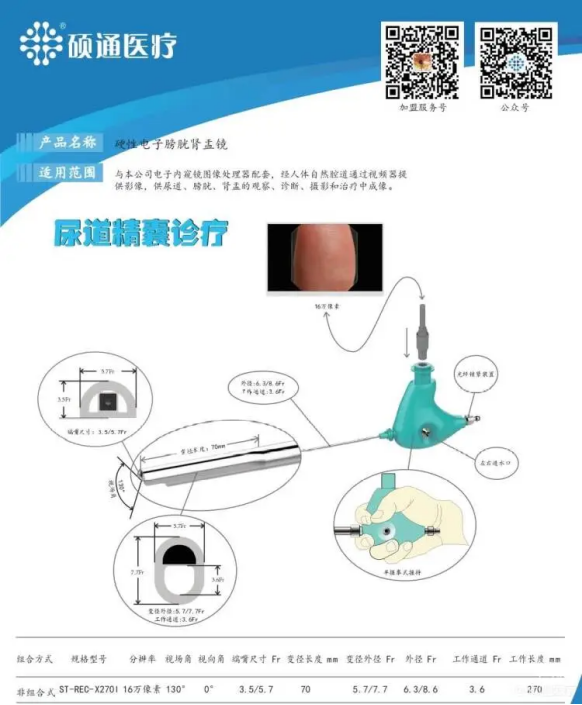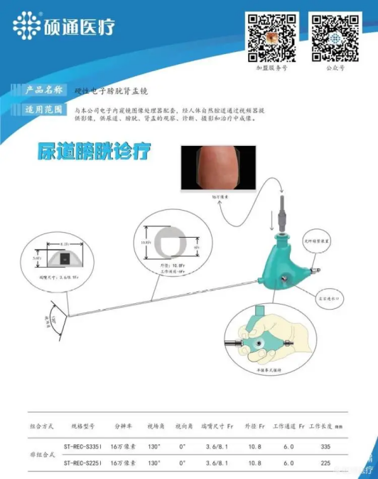 Another blockbuster product From Shuotong Medical--electronic seminal vesiclescopy1The mirror operation part is designed for semi-clench fist grip, which is lighter and comfortable, reduces the surgeon's hand fatigue and strain.2 Mirror mouth only 3.5/5.7Fr, reduce the broken wall, the existing product on the market are 4.5/6Fr; the front end variable diameter outer diameter 5.7/7.7Fr, length 70mm, the transition is smoother, and it is easier to reach the seminal vesicle.3 Working channel 3.6Fr, through more instruments, the mirror does not need to exit at the same time as the biopsy pliers during the sampling biopsy to avoid repeated entry and exit.4 The field of view angle is 130°, the conventional one is 110°, the optical mirror is 70°~90°, and the field of view is larger. Diagnosis and treatment of urethral bladder (hard electronic urethral cystoscopy)